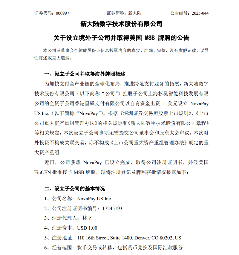 7月1日,新大陆(000997)(000997.SZ)公告称,公司控股子公司香港星驿支付有限公司的全资子公司NovaPay US Inc.已设立完成,并取得美国FinCEN批准授予的MSB牌照。NovaPay US Inc.的注册资本为1美元,经营范围包括货币交易或转移,包括货币兑换及国际汇款服务。公司获取美国MSB牌照,旨在为开展跨境资金业务提供合法准入资质,覆盖货币兑换、汇款、数字货币交易等场景,为对接全球主流金融机构提供基础设施,奠定跨境支付相关业务开展的基础,助力公司全球化战略布局,为实现数字商业领军企业的美好愿景贡献重要力量。